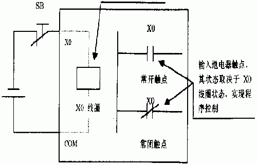 ![]() 图1 PLC输入信号采集示意图 图1中,输入设备选用的是按钮SB0的常闭触点,输入继电器X0的线圈状态取决于SB0的状态。该按钮未按下时,输入继电器X0线圈状态为"1"通电状态,程序中所有X0触点均动作,即常开触点接通,常闭触点断开;若按下该按钮,则输入继电器X0线圈状态为"0"断电状态,程序中所有X0触点均恢复常态。如果输入继电器连接的输入设备是按钮SB0的常开触点,则情况恰好相反:在该按钮未按下时,输入继电器X0线圈状态为"0"断电状态,程序中所有X0触点均不动作;若按下该按钮,输入继电器X0线圈状态为"1"通电状态,程序中所有X0触点均动作。