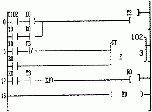 上面两个程序中,输出Y3、计数器CTl02及内部通用继电器R0前面的逻辑条件均相同,仅仅是计数器CTl02所在语句位置发生了变化,而两段程序的运行结果就截然不同。这是因为CTl02对输出Y3的影响方式发生了变化。执行第一段程序时,将首先判断输出Y3的状态,再判断CTl02的状态,CTl02的状态变化只能在下一个扫描周期对Y3产生影响;而执行第二段程序时,将首先判断CTl02的状态,再判断输出Y3的状态,CTl02的状态变化将在该扫描周期直接影响Y3的状态。