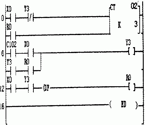 ![]() 图6 程序2 程序2程序调试结果.X0接通3次,Y3接通瞬间即断开。