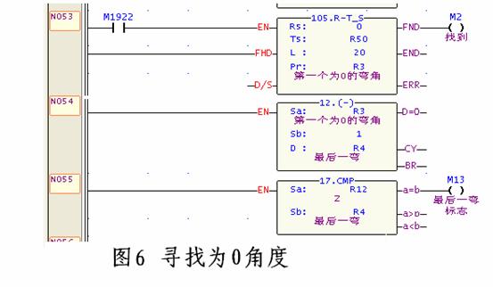 厦门永宏亚得机电科技有限公司 陈火文 Chen Huowen 摘要:本文着重介绍了利用永宏FBs系列可编程控制器实现自动三维弯管机控制系统的设计。重点阐述了该系统的工作原理、硬件结构和软件设计,实践证明该弯管机系统实用性强、使用方便。 关键词:可编程控制器 工厂自动化 高速计数器 三维弯管机 Abstract: The paper mainly intruduces the design of FATEK FBs Series PLC in Automatism Three-directional Tube Bender Machinery control system. the operation principle, hardwire structure and software implementation were mainly stated, and the Tube Bender Machinery has been proved is Practicability and convenience by application. Key word: PLC Factory Automation High-Speed Counter Three-Directional Tube Bender Machinery 1 引言 七八十年代,是中国工业经济快速发展的初期。各行各业急待发展,基础设施建设如火如荼地进行着。厂房、设备、交通设施需求急剧增加,各种金属管的需求已远远不能满足,许多金属管的形状要求也不断复杂化,从而催生了弯管机系统设计和开发。由于国内技术水平的落后,许多弯管设备开发设计只停留在初级阶段,继电器式的电气控制系统生产出来的产品质量和产量都没有达到人们对各种金属管工艺的理想要求。90年代后,中国经济水平的飞速发展和不断提高,以及PC技术在工业中广泛应用,二维式的弯管机已无法满足复杂的工业需要。三维弯管机正是在这一背景下逐渐开发成型,而可编程控制器(PLC)在弯管机控制系统中发挥了重要的作用,给复杂要求的弯管系统提供了重要的技术保证。 自动三维弯管机系统要求有三组脉冲信号输入,两组脉冲信号输出,强大的档案功能。永宏PLC正是由于其单个CPU可同时处理四组硬体高速计速器,同时输出四组脉冲,实用的FUN160档案功能,满足了三维弯管机控制系统的复杂要求,广泛引用于弯管机行业。 2 系统的概述 (1)系统结构 自动三维弯管机控制系统主要由可编程控制器(PLC)、旋转编码器、步进电机、人机界面(HMI)和液压油泵组成。旋转编码器主要用于角度量测和长度控制,步进电机主要用于旋转角度控制和驱动小车实现长度控制,电磁阀配合液压油泵用于实现弯管动力。 (2)系统功能 A、分手动、半自动、全自动等多种操作方式,并可满足有芯棒和无芯棒,单角度和多角度,二维角和三维角选择等不同控制要求场合的特定需要。 B、可存储上百种产品型号,每种型号可设定20个弯管角度参数和20个旋转角度参数,可满足多种复杂、多角度、不同空间的要求,并可对工作进度进行实时监控显示。如图1所示; ![]() C、可自由调整设定“夹紧时间”、“退夹时间”、“进芯时间”,满足实际工艺要求,以及防止机械上的动作延时造成的次品; D、可选择试机模式,用于机械的磨合,符合管理员权限的人才可选择试机模式,对不同的用户进行不同的操作从而保证系统安全。如图2所示; ![]() E、可设定机械的使用期限,符合管理员权限的人才可对机械的使用期限进行设定; F、完善的报警系统,在操作不当或机械故障时能在屏幕上作出提示,并停机报警。如图3所示。 ![]() (3)系统I/O分配 系统选用1台FBs-24MCT主机,1台FBs-8EA输入输出扩展模块和1台FBs-8EY输出扩展模块。其输入输出端子分配情况如下所示。 输入信号: X0 弯管编码器A相 X1弯管编码器B相 X2 小车编码器A相 X3 小车编码器B相 X4 旋转编码器A相 X5 旋转编码器B相 X6 原点信号 X7 退芯到感应信号 X8 辅推前感应信号 X9 辅推后感应信号 X10 进入托料感应区 X11 小车进入辅推干涉 X12 脚踏信号 X13 退弯安全开关 X14管料检测信号 X15-X17 系统预留 输出信号: Y0 步进电机1A相 Y1步进电机1B相 Y2 夹料动作 Y3步进电机2A相 Y4 步进电机2B相 Y5留慢退芯 Y6 电磁铁 Y7 进芯 Y8 主夹退 Y9 副夹退 Y10 退弯 Y11 夹料退 Y12 退芯 Y13 辅推退 Y14 慢弯管 Y15 溢流阀 Y16 慢退芯 Y17 慢弯管 Y18 主夹进 Y19 副夹进 Y20 弯管动作 Y21 油泵 3 系统的软硬件实现 系统主要工作步骤有弯管主副夹夹紧、有芯进芯并计时、弯管、辅推弯管、慢弯进行、主副夹退夹、步进电机动作旋转、退弯动作、退芯完成等。其主要工作流程如图4所示。 ![]() (1)档案系统管理设计 根据不同用户的实际要求,需要产品多样性,弯管角度参数灵活可变的特点,三维弯管机系统在设计时要求PLC拥有强大档案处理功能。在系统设计中,采用了FUN160功能指令,如图5所示。当M1=OFF,M0由0→1时,自暂存器R0开始,将长度为暂存器R101的资料写入以档案寄存器F0开始的区块中(指标暂存器R100的资料为F0的第N个区块);当M1=ON时,M0由0→1时,自资料寄存器F0开始的第N个区块(指标暂存器R100的资料为N)的暂存器资料存入以暂存器R0开始的资料暂存器区(该区长度为R101的资料)。 ![]() (2)角度参数的设计 系统的每一个零件最多可设定20个弯管角度和20个空间旋转角度。由于每种零件的弯管角度不可能全部设定,当一种零件的弯管角度个数少于20个(即其它角度均为0),CPU将继续进行扫描,直至20角度全部执行完毕,这在很大程度上不仅浪费了CPU的扫描时间,也降低了系统工作效率。因此,在设计过程中,采用为0参数寻找方式,程序设计如图6所示,当20个参数暂存器中第N个为0时,M2=ON,此时R4的资料为第N个参数暂存器,并告知CPU执行到时结束执行弯管命令。