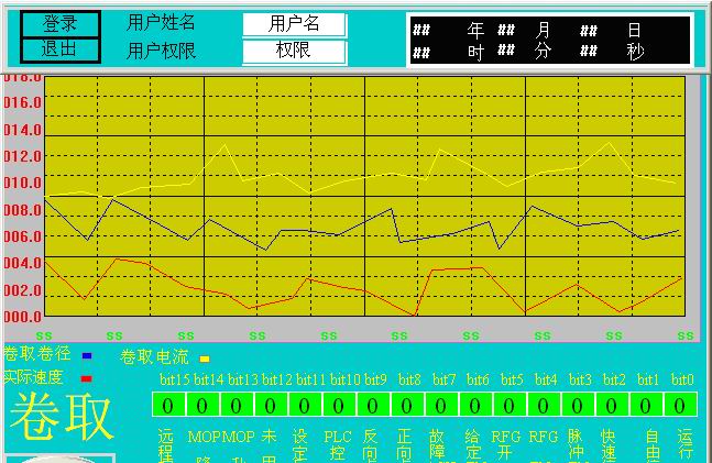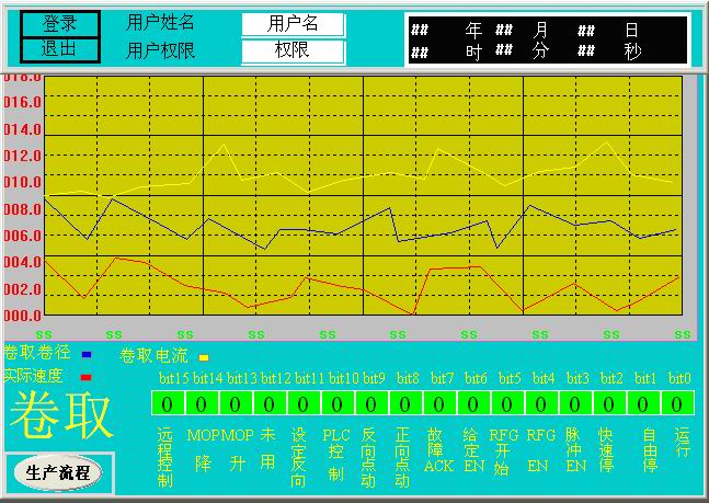 卷取、导开,贴合,冷却,接取、摆料、喂料等画面设置相同。它们都是由卷径,电流和实际速度实时趋势曲线和离散数值描述的。