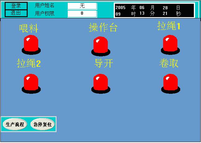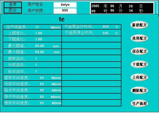 在ET组态软件中编制系统的组态界面。根据本系统的特点及实际使用情况,界面设计由系统生产线流程、配方、浮辊指示、主机状态、主机电流、主机速度、急停指示、卷取、导开、贴合、冷却、喂料、摆料及登陆标题栏等13个画面组成。
