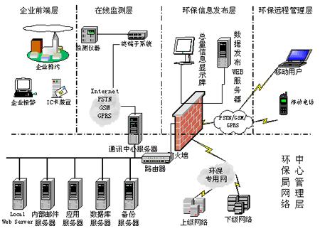 4)选用先进的开发技术,应用系统操作简便、人机界面友好,适合各层面人员操作使用。 5)具有超前的设计理念,根据环境管理工作的发展和要求,能够随时进行扩充,并应兼容现有的应用系统。 6)在网络覆盖面、可靠性、稳定性、实时传输速度、数据传输的准确性及安全性、操作界面、建设投资及系统日常运行费用合理等方面具有良好的体现。 2.系统网络结构图