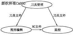 图5 刀具管理系统的总体结构 随着当今制造业灵活快速制造的发展,数控冲床也向着具有多种复合功能、更加稳定可靠、更大柔性、适应多品种小批量的方向发展,有建立冲压过程的柔性制造系统的发展趋势。本文在进行数控系统监控和编程系统的研究和开发时,力求增强系统柔性,将监控和编程系统作为一个内部彼此联系、相互作用、相互制约的集成性整体。本系统各部分的功能相对独立,刀具管理系统进行刀具库和刀塔的管理和控制,根据刀具和刀塔参数生成刀具文件;图形编程系统根据输入的图形和加工信息生成NC程序文件;监控系统则对冲床加工进行监控和控制。另一方面,整个系统又是一个相互联系、相互制约的集成性整体,图形编程时,要以刀具管理系统所生成的刀具文件为依据进行人机交互刀具选择;而在对冲床进行自动加工控制时,需要输入相应的NC程序,而且在加工前要进行刀具检查,检查该NC程序所需刀具和刀塔上安装的刀具是否一致。图6所示为本系统各部分之间的联系。