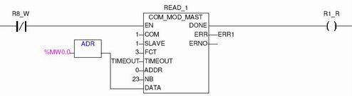 图6 AC500 程序图 只需设定好MODBUS功能块的(COM,SLAVE,FCT,ADDR,NB等)参数,PLC主站就可以顺利的从1#I/O子站读取数据。其中FCT,NB的参数可根据实际情况依照表2确定 。
