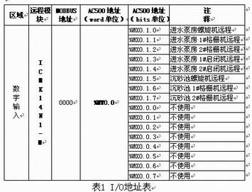 PLC主站通过CPU(PM581)上保留的CS31通讯接口、CS31通讯总线与分布I/O(AC31远程扩展模块)构成高速通讯网络,随时采集现场设备的运行状况和故障信息,并上传工控计算机 ,形成分布控制。 本系统共设8个分布I/O。从经济角度考虑,由于AC500系统可以兼容AC31的远程扩展模块, 1#~8# 分布I/O分别选用AC31系统的远程扩展模块(ICMK14 N1-24DC)。分布I/O置于污水控制现场, 就近控制所属设备,形成分布控制的能力,并采集现场设备的运行状况和故障信息,通过CS31总线联接到PLC主站 。CS31总线是一种点对多点的RS485串行通讯。每个通讯系统由一个主站和最大31个从站组成。通讯距离不加中继为500米,加中继最大可达到2000米。通讯介质为:屏蔽双绞线。 以1#分布I/O远程扩展模块为例,定义它的地址表,如表1: