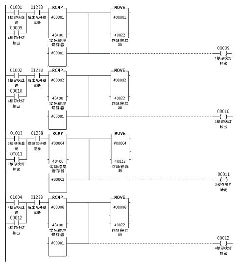 (4)楼层召唤灯指示模块:当有楼层召唤登记(如01001)或已有该楼层召唤灯输出(如00009)时,如果实际运行楼层(40400)不等于召唤楼层,则该楼层召唤灯输出显示亮;如果实际运行楼层(40400)不等于召唤楼层,则该楼层召唤灯输出熄灭。