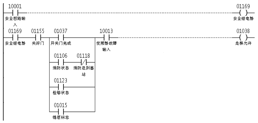 (1)电梯自检模块:安全回路中各开关接触良好,安全回路信号(10001)输入,安全继电器(01169)闭合。当电梯开关门完成(01037),关门到位(01155)输出为ON,且处于非强制状态时,如果变频器无故障输入(10013),则电梯允许(01038)正常运行。