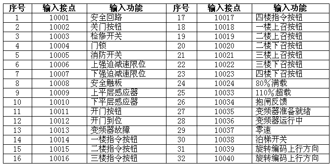 输入输出单元为PLC的I/O接口部分,主要由厅外呼叫、轿箱内选层、楼层及方向指示、开关门、井道内的上下平层、上下强迫换速开关、门锁、安全保护继电器、检修、消防、泊梯、称重等单元构成。输入单元为:(1)厅外呼叫单元,用来对各层站的厅外召唤信号进行登记、记忆和消除,而且兼有无司机状态的“本层厅外开门”功能,全集选方式的呼梯信号为2N-2个(N为层站数),下集选方式的呼梯信号为N个;(2)轿箱内选层单元,负责对预选楼层指令的登记、消除和指示,呼梯信号数为电梯停站层数N;(3)开关门按钮,输入PLC控制轿门的开闭(厅门也同时动作);(4)上下平层装置,用来保证电梯轿箱在各层停靠时准确平层,通常设置在轿顶,电梯轿箱上行接近预选层站时,上平层感应器限进入遮磁板,电梯仍继续慢速运行,当下平层感应器再进入遮磁板时,上行接触器线圈失电,制动器抱闸停车;(5)上下限强迫换速开关,用于保护电梯的高速运行安全,避免电梯出现冲顶或蹲底事故,当电梯到达上下端站时,装在轿厢边的上下限强迫换速开关打板,信号输入PLC,PLC发出换速信号强迫电梯减速运行到平层位置;(6)门锁装置(或轿门和厅门联锁保护装置),轿门闭合和各厅门闭合上锁是电梯正常起动运行的前提;(7)安全回路,通常包括轿内急停开关、轿顶内急停开关、安全钳开关、限速器断绳开关、限速器超速开关、底坑急停开关、相序保护继电器、上下限极限开关等;(8)检修、消防和泊梯,检修、消防和泊梯为电梯的三种运行方式,检修运行为电梯检修时的慢速运行方式,消防运行有消防返回基站和消防员专用两种运行状态,泊梯状态,消除内选和外呼信号,自动返回泊梯层、关门并断电;(9)称重单元,用来检测轿厢负荷,判断电梯处于欠载、满载或超载状态,然后输出数字信号给PLC,根据负载情况进行起动力矩补偿,使电梯运行平稳。输出单元为:(1)楼层及方向指示单元,包括电梯上下行方向指示灯、层楼指示灯以及报站钟等,目前的方向及层楼指示灯主要有七段码显示方式和点阵显示方式,本系统为七段码显示方式;(2)开关门单元,用于控制电梯的厅门和轿门的打开和关闭,在自动定向完成或电梯平稳停靠后,PLC给出相关指令,由变频门机完成开关门动作。
