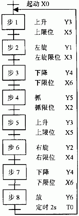 ![]() 图8 某机械手动作流程图 从机械手动作流程图可以看出,这个控制任务每个循环的工作可以划分为八步,其中第1步与第5步动作相同,均为上升;第3步和第7步动作相同,均为下降。在利用步进指令进行编程时,这两个工步所对应的程序段的输出不能直接设置为Y3、Y4,同一个输出使用两次则会出现语法错误。这时应考虑使用用于存储中间状态的内部通用继电器Rn来解决这个问题。如图7所示梯形图程序,其中R1、R5分别被定义为第1步与第5步的输出,R3、R7分别被定义为第3步与第7步的输出,在步进结束后再将R1、R5的状态输出到上升Y3,将R3、R7的状态输出到下降Y4,通过这样的方法可方便解决顺序控制任务中若干工步输出相同的问题。