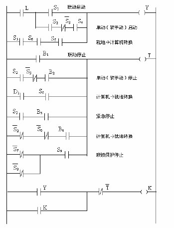 图1 单台设备起/停控制梯形图 4.2 破碎机恒定负荷控制 Nordberg HP 圆锥破碎机是本次项目改造中的关键设备,为使其稳定在最佳工作负荷状 态,达到最大处理能力,采用恒定功率控制方式,以主传动电机的功率(电流)作为被控参数, 通过变频调速,动态调整给矿皮带给矿量的大小。经实验分析发现,若仅以电机功率作为被 控参数构成单回路控制系统,由于给矿皮带的传输需要一定的时间,即存在纯滞后,当给矿 量扰动发生后,将导致调节作用大大滞后,且易发生振荡,系统动态品质难以保证。为了克 服系统的纯滞后,决定采用串级控制:在给矿皮带上安装电子皮带秤,以给矿量为副参数, 主传动电机的功率为主参数构成串级控制系统,见图2。