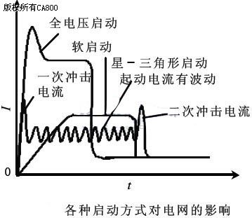 从图中可看出,若采用一般降压启动,假设启动电压U=0.5Ue,则电动机启动时的转矩为0.25Mn,即启动时的转矩只有电动机最大转矩的1/4。如果在此时将电压U加大到电动机额定电压Ue, 则电动机的转矩一下子就从1/ 4 跳到Mn, 这样的启动过程是跳跃的、不平滑的,对生产工艺要求平稳启动的场合不宜采用。而软启动从初始电压开始电压连续平稳地增大。从图1中0.5Ue 的那根曲线连续平滑的不断向右平行移动,一直平稳到与额定电压Ue那根曲线重合时为止,那么电动机的转矩就会平滑地增大一直到转矩为最大值Mn时为止,启动过程也就结束。这样,启动过程中电动机的转矩是平滑的而不是跳跃的,启动过程是平稳的。 2、启动方式对电网的影响 比较异步电机的各种启动方式,如(图2)所示,可以看出当电机全压启动时,对电网的冲击最大,冲击时间也最长,而通常使用的降压启动对电网的冲击虽比较小,但是由于涉及到一个线圈电压切换过程,所以出现二次冲击的不利环节,软启动由于在启动前设定了一个不对电网产生影响的启动电流,电流是缓慢增大至设定电流,故无冲击电流,对电网的影响最小,并且能消除启动力矩的冲击。