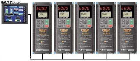 根据以上控制要求,本方案不用变频器同步卡和PLC控制,充分利用富士POD集控制、通信、数据处理及人机界面于一体的强大功能,采用POD实现5台变频器集成联动频率和参数换算,及相应各台变频器的频率,线速度,工作电流 的集中显示。并利用POD内的存贮器,将各种工艺参数存贮起来,每次开机时根据不同产品生产,一键式调用工艺参数。