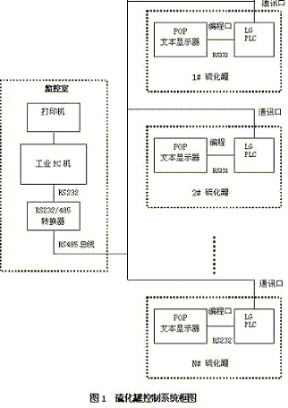 控制各硫化罐的LG PLC通过其通讯口的RS485总线和计算机远程连接成一套集中控制系统。在通信过程中,主控计算机为主站,各硫化罐PLC为从站,通讯协议遵从MODBUS通信协议,从站数目前为12个。POP-HMI文本显示器通过LG PLC的编程口(RS232)与LG PLC相连接,通讯协议为LG PLC的专用协议。