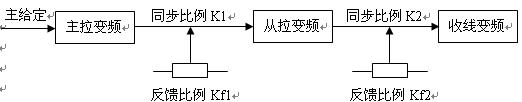(2 )控制算法设计。根据实际控制对象的特性,要求快速响应,同时调节范围有限。因此考虑用比例的关系进行调整,因为大拉机械设计上与微拉、小拉、中拉有很大的不同。前者收线都存在卷径的变化,由卷径的变化而影响速度。而大拉的收线部分不同于前者,可以忽略卷径的变化。算法如下公式所示: