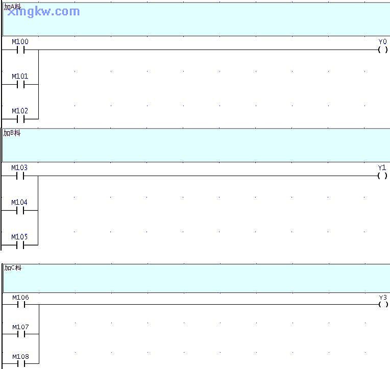 【控制程序】首先将各种原料加入的下限、上限时间设定在缓存器表格中,如下图: