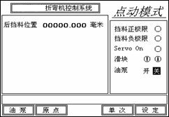 此模式下可通过脚踏开关(上下各一个)完成滑块的上下点动。点动X\Y键可实现对后挡料的点动控制,相应的后挡料位置会实时的现实在LCD屏幕上。在滑块处于原位时,点动U/I键可实现挡块的上下调节(见图2-4)。