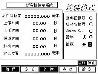 在执行单次模式的情况下,在调整好各个参数之后,可通过按连续功能键来进入连续模式(见图2-7),不过,一定要同时踩着脚踏开关才能生效,此时系统将不停的重复整个折弯过程(后挡料定位→滑块快下→慢下→辅退→上压→卸荷→回原位→上停→后挡料定位→……),而不需踩脚踏开关。同样,可通过踩脚踏开关上或按Reset复位键来实现城市的停止。