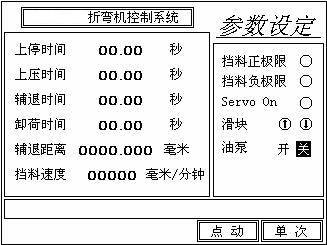 在点动画面或单次画面下,在确认系统处于停止状态时,可通过按设定功能键切换到参数设定画面,再次画面下可设定折弯机系统的一些参数,如:上停时间、上压时间、辅退时间、卸荷时间、辅退距离、挡料速度等参数。