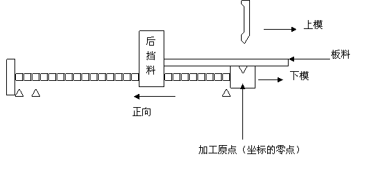 寻原点动作:点击原点下面的功能键,后挡料向后找寻原点(参看图2-5),遇机械原点开关后停止,此为机械原点,原点之功能键提示反白 ,表示回原点完毕,在此之前任何操作将视为无效。因此,每次开机后,必须运行回原点之动作,方能确保后挡料定位准确。