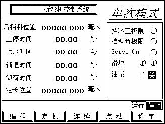 单次、设定功能键:用于模式画面切换,只有在已完成回原点动作,并且后挡料处于静止状态时,方起作用,可切换到相应的模式画面。