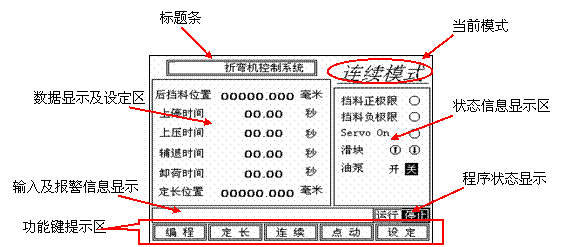 状态信息显示区:用于显示挡料极限、伺服Servo ON状态、滑块电机上下点动状态、油泵的开关状态等信息。