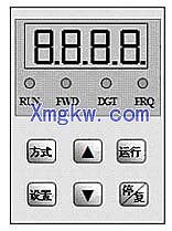 LED数码管显示当前输出频率、当前转速(rpm)、当前输出电流、当前输出电压、当前线速度、故障类型以及系统参数、操作参数;LED灯指示变频器当前的工作状态