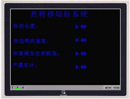 这一面贴完了以后,另外一面开始贴,其过程和这一面是一样。 贴完毕以后,再通过一个吹气装置把桶的外面的杂物吹掉。然后一个加热装置把标的表面加热,使其更光滑明亮,由传送带送出去,由人工筛选把贴好的桶装起来。 在换不同的桶时,可以通过触摸屏调整标的大小和标贴在桶边的距离等等参数。 2、技术分析: 这个设备主要有三点的配合是关键:第一,扶稳和冲气装置的驱动的运行速度和贴标时的速度必须与传送带的速度一致,考虑用一个编码器采集传送带的速度送给控制器,由控制器的同步功能来实现其要求。第二,贴标时和桶的切入点必须调整合适,通过计算所贴的标纸经过送标纸电机驱动标纸到贴标的位置和桶运行到贴标的位置运行的时间一致。第三,必须要把温度、气压、机械、电气部分的驱动结合在一起调整。温度是采用温度控制仪进行控制。这个必须根据不同的塑料桶的材料和不同的现场情况调整。 3、设备的电气部分配置: 1)、运动控制器 需要采用一个八轴半或者是两个四轴半的数字运动控制器,所谓半个轴就是一个编码器的输入通道,四个轴分别控制四个电机,做扶稳冲气装置、贴标装置的三个的运动控制,两侧就需要八个轴,可以把两侧分开处理,所以也可以采用两个四轴半的数字运动控制器。同时总共还需要有16个输入点和3~6个输出点,最后从各个方面考虑,选用两个英国TRIO的数字运动控制器MC206来分别控制两侧的贴标;该控制器的通讯口具有ModBus协议,可以直接接触摸屏。另外,该控制器既可以控制步进电机,也可以控制伺服电机,或者是两者的任意结合。而且,该控制器除了控制轴所用的编码器接收通道以外还专门带一个编码器的输入口。 2)、触摸屏 采用WinView的触摸屏MT508TV45WV,随时可以在触摸屏上根据不同的塑料桶来修改相应贴标的相关参数,其操作界面如下: