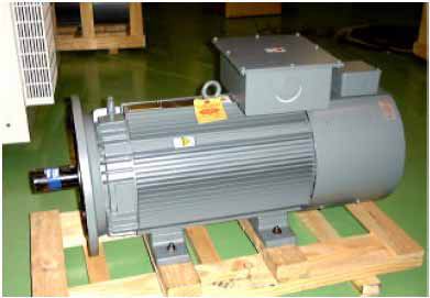 3.7 ED马达(永磁式同步电动机) 为了实现的无轴传动机的最大特点「runningplatechange」的功能,有必要把印刷装置的左印刷辊和右印刷辊分别驱动,但以前使用的感应马达的外形尺寸大而且在机械上安装是有难度的。为此这次采用了新的小形轻量高效率的「ED 马达」与「ED64SDS 驱动器」,解决了安装空间尺寸的问题。 图5 表示45kW ED 马达。