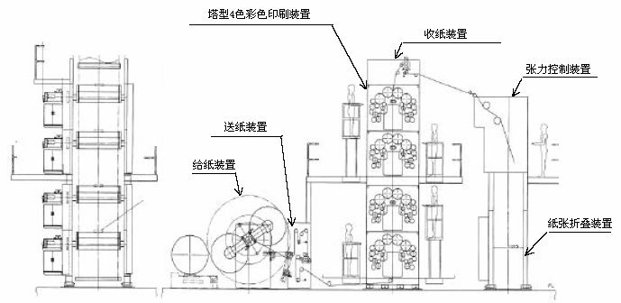 (1)4 色彩色印刷機的各彩色印刷装置的左印刷辊和右印刷辊由高精度同步定位控制器来驱动,实现纸张传送机构的满负荷无轴化。