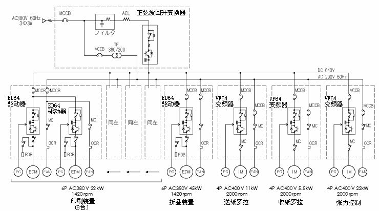 使用同步定位功能的印刷部及纸张折叠部,使用的是「ED 马达」和「ED64SDS」驱动器,使用速度控制功能的送纸部收纸部张力控制部,使用的是「VF64」矢量控制变频器。主控制盘的FA 控制器「μ-GPCH」,以及主控制辅助盘上的「μ-GPCH」是由通信网络「D-RING」连接在一起,控制着整个系统。「μ-GPCH」和「ED64SDS」以及「VF64」变频器使用JEMA 标准网络「JPCN-1」来互相通信、传送讯息。