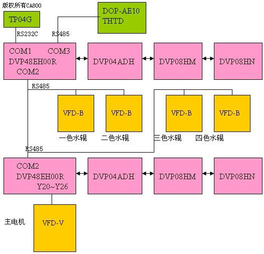 根据以上对新机XJ4142胶印机和台达EH系列PLC功能的分析,我们与中达电通公司合作,提出了一种采用两个EH系列PLC分别作为主站和从站,把台达文本显示器、人机界面及四个B型变频器与PLC通过通讯口连接在一起,构建成新型电控系统。