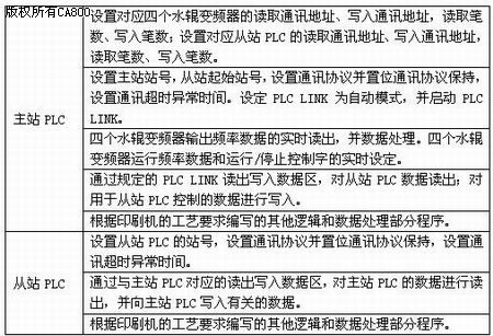 (3)本机设有一个主控制台电箱和一个主电柜,主控制台电控箱在输纸机的操作侧,主电柜在传动侧;其中主站PLC在主控制台电箱里,从站PLC在主电柜里。主站PLC主要用于输纸机和一二色印刷机组的信号采集及处理。从站PLC主要用于主电机变频器控制、三四色印刷机组和收纸机的信号采集及处理。主站PLC和从站PLC通过RS-485通讯线连接。主控制台电箱里还有一二色印刷机组的出水辊变频器,主电柜里有主电机变频器和三四色印刷机组的出水辊变频器。一二色出水辊变频器和主站PLC采用RS-485通讯线连接和控制。三四色出水辊变频器和主站PLC采用RS-485通讯线连接和控制。这样四个印刷机组的出水辊变频器和从站PLC都作为从站和主站PLC就组成了RS-485通讯网络。利用台达PLC的EASY LINK功能可以实行1:N控制。主电机变频器从安全可靠方面考虑仍采用I/O控制,参见图1。