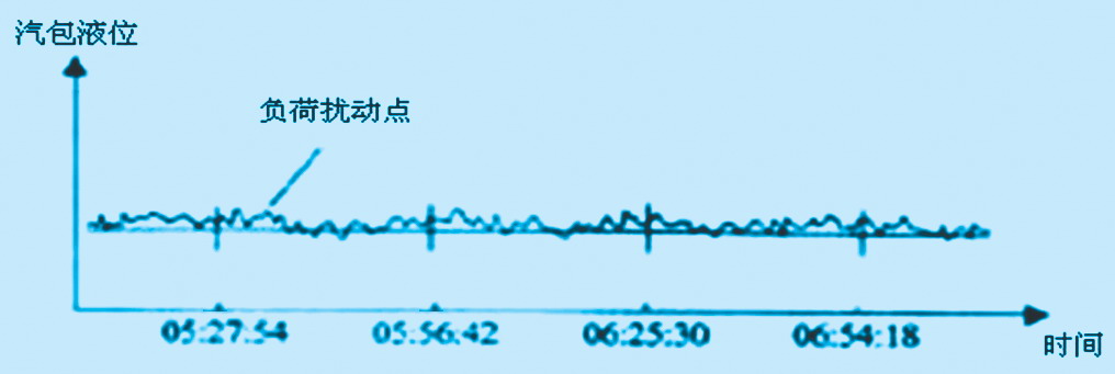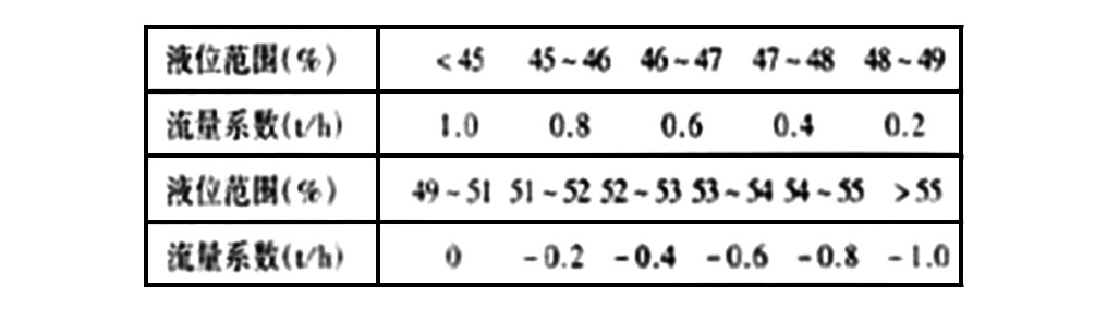 其中系数K为汽水损失率(给水流量与蒸汽流量的比值),范围为1.1~1.2。PID参数为P=300%、I=0.4、D=0。这组PID参数可以使阀位波动幅度不大而回路有较快的跟踪效果。液位前馈系数与锅炉额定负荷密切相关,一般是额定负荷越大前馈系数也越大。本项目废热锅炉的额定负荷为35t/h。前馈系数按表一给定,见附表: 附表 前馈系数表  投运时首先投运给水流量单回路,调节平稳后,再切换为蒸汽流量比值控制,液位前馈同时起作用。以汽定水+液位前馈比值控制方案调试投运简单方便,投运后经负荷扰动(产汽量变化)、液位扰动(排污量变化)实验,抗扰动性能良好,投运以来运行平稳,达到工艺要求。图4为2.5h实时液位记录曲线,其中记录了负荷扰动情况。液位波动范围<±3%。
