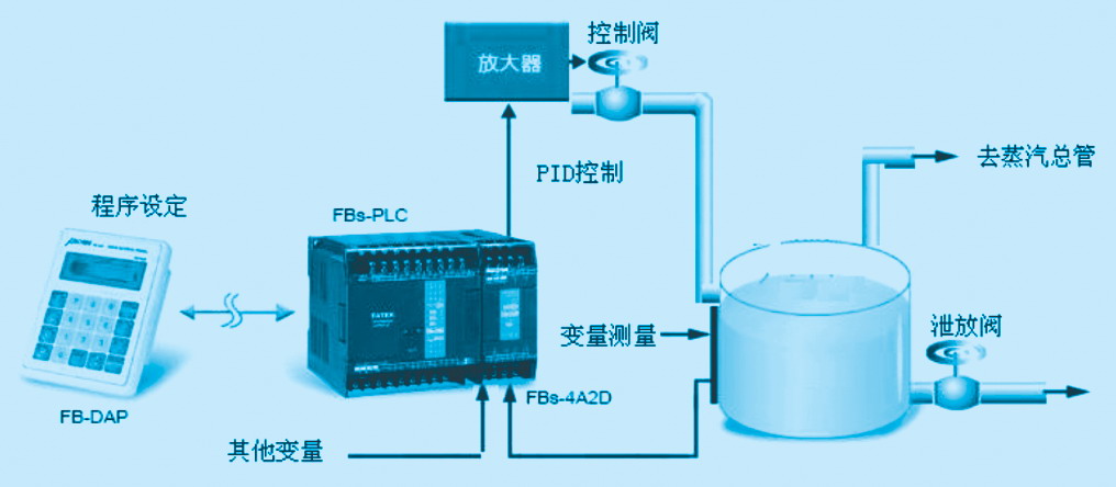 图5 永宏PLC控制系统示意图 4.2 汽包水位PID控制设计优点 (1) 减少干扰对主回路的影响,可由副回路控制器予以校正。 (2) 由于副回路的存在减少了相位滞后,从而改善了主回路的响应速度。 (3) 对控制阀特性的变化具有较好的鲁棒性。 (4) 副回路可以按照主回路的需求对对象实施精确控制。 实际PLC的控制程序采用主副回路进行串级控制,即主回路的输出做为副回路的设定值,经副回路输出作用于被控对象。也可以不用副回路只用主回路形成单回路调解,或手动操作完成。一般常见的过程控制应用, 开环回路控制就可以满足大部份的应用要求,但随着使用时间、组件特性变化或受控负载或外界工作环境的变化,开环回路控制因为没有真实将受控程序的实际量反馈到控制器,因此控制结果可能与实际期望的结果会有些落差,闭环回路PID过程控制是用来克服并解决上述缺点的极佳选择。FBS-PLC提供软件数字化的PID数学表达式,对于一般反应的闭环回路过程控制就可应付,但对于工业锅炉这样的需要有快速反应的闭环回路控制要使用本功能需要事先评估是否可行。典型的闭环回路程控示意图如图6所示。