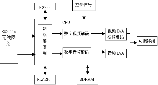 2).在嵌入式操作系统环境下,对以VW2010为核心的A/V模块进行初始化配置和VW2010驱动程序加载。 3).对模拟音频视频进行A/D转换,并以MPEG-4的格式进行压缩编码。 4).将压缩编码后的数据流通过无线网络进行转发。 5)可以对压缩编码后的数据流/文件进行保存,对输入的压缩编码音频/视频文件进行 解码和模拟音频视频播放输出。