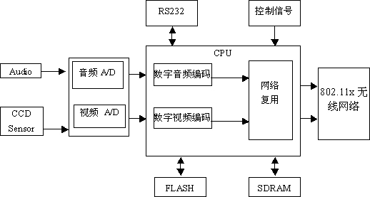 linux操作系统,由服务器端和客户端两部分组成的系统。主要实现音频视频的高质量编解码和网络转发功能,服务器端具体实现功能如下: 由CCD Sensor和音视频端口进来的输入信号,经过视频A/D和音频A/D转换后,进行MPEG4视频编码和MPEG MP3音频编码。编码后的视音频码流送到网络复用模块打包后,经过802.11x无线网络送到客户端。具体功能如下: