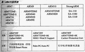 摘要:本文简单介绍了arm系列处理的结构和技术特性。针对目前应广泛的arm7,详细介绍了相应的软件工具和硬件工具以及操作系统,并构建了一个pda方案来说明其实际应用。 关键词:arm soc pda 一、引言 作为soc(system on chip)的典型应用,和持电话、机顶盒、数码像机、gps、个为数字助理以及因特网设备等产品的市场需求越来越大。目前,基于arm的处理器以其高速度、低功耗等诸多优异的性能而成为上述各类产品中选用较多的处理器。 二、arm内核 arm内核分为arm7、arm9、arm10以及strongarm等几类。其中每一类又根据其各自包含的功能模块而分成多种构成(见表1) 在arm内核中有四个功能模块可供生产厂商根据不同用户的不同要求来配置生产。这四个模块分别用t、d、m和i来表示。 t:表示thumb,该内核可从16位指令集扩充到32位arm指令集。 d:表示debug,该内核中放置了用于调试的结构,通常它为一个边界扫描链jtag,可使cpu进入调试模式,从而可方便地进行断点设置、单步调试。 m:表示multiplier,是8位乘法器。 i:表示embeddedice logic,用于实现断点观测及变量观测的逻辑电路部分,其中的tap控制器可接入到边界扫描链。 arm7 arm7采用armv4t(newman)结构,分为三级流水,空间统一的指令与数据cache,平均功耗为0.6mw/mhz,时钟速度为66mhz,每条指令平均执行1.9个时钟周期。其中的arm710,arm720和arm740为内带cache的arm核。 arm9 arm9 采用armv4t(harvard)结构,五级流水处理以及分离的cache结构,平均功耗为0.7mw/mhz。时钟速度为120mhz- 200mhz,每条指令平均执行1.5个时钟周期。与arm7系列相似,其中的arm920、arm940和arm9e为含cache的cpu核。性能为 132mips(120mhz时钟,3.3v供)或220mips(200mhz时钟)。 arm10 arm10采用armv5t结构,六级流水处理,指令与数据分离的cache结构。平均功耗为1000mw,时钟速度为300mhz,每条指令平均执行1.2个周期,其中arm1020为带cache的版本。 arm10tdmi:与所有arm核在二进制级代码兼容,内带高速32x16mac,预留dsp协处理器接口。其中的vfp10(矢量浮点单元)为七级流水结构。 arm1020t: arm10tdmi+32ki&d caches+mmu结构,300mhz时钟,功耗为1w(2.0v供电)或00mw(1.5v供电)。指令cache和数据cache分别为32k,宽度为64bits。能够技术多种商用操作系统。适用于下一代高性能手持式因特网设备及数字式消费类应用。 strongarm strongarm处理器采用armv4t的五级流水结构。目前有sa110、sa1100以及sa1110等三个版本(见表2)。 三、arm7系列开发工具及开发环境 1.软件开发工具 green hills tools:green hills的arm软件工具包能够支持arm6、arm7、arm7m、arm7tm、arm7tdmi、arm7500fe、arm8、arm9、 arm10以及strongarm等系列处理器。它由编译器、交叉工具包、集成开发环境和调试接口等组成。 compiler:高优化性能的c/c++编译器。 cross tool chain:交叉开发工具。包括汇编器(assembler)、连接器(linker)、库函数以及目标代码格式转换器。 multi:集成开发环境。green hills的multi集成环境综合了软件开发和调试过程中要用到的各种工具,如源级调试器、工程管理器、版本控制器、文本编辑器、性能分析器、图形浏览器。运行出错检测器、arm指令集仿真器以及底层调试接口等。用户可方便地在multi环境中利用上述工具来开发应用程序。 servers:底层调试接口。green hills的servers提供两类调试接口供用户选择使用。一类用于angel监控器、在线仿真器以及epi公司的jeeni jtafg仿真器等;另一类则用于商用操作系统及用户自己编写的操作系统。 asdt2.5:sdt2.5是arm公司提供的一大套由c编译器、连接定位器、c语言调试器和angel监控器组成的开发软件包。由于价格比较适中而应用比较广泛。 2.硬件开发工具 arm 的硬件开发工具主要包括两类仿真器,一是jtag仿真器,二是全功能在线仿真器。前者是利用arm处理器中的调试模块的功能,通过其jtag边界扫描口来与仿真器连接。这种方式的仿真器比较便宜,连接比较方便。但由于仅通过十几条线来调试,因而功能有局限。目前arm处理器的jtag仿真器在市场上比较流行的是epi公司的jeeni和majic,著名的德国lauterbach公司有一款通用jtag/bdm/once仿真器trace32-icd也能够很好的支持arm系列处理器。对于全功能在线仿真器来说,由于其信真头完全取代目标板上的cpu,因而功能非常强大。但这类仿真器为了能够全速仿真时钟速度高于100mhz的处理器,通常必须采用极其复杂的设计和工艺,因而其价格比较昂贵。lauterbach公司的trace32-fire就是这类产品的佼佼者。 jeeni仿真器:这是一种价位较低的jtag仿真器。它能够很好地与sdt2.5工具连接。用户可使用其编译器和调试界面。 majic仿真器:与jeeni相比,majic能够通过100base-t以太网与主机相连,支持多处理器和低电压i/o。 trace32 -icd:这是一种通用jtag/bdm/once仿真器,既能够支持motorola系列的68k、coldfire、mpc5xx/8xx、 mpc82xx,又能够通过更换模块来支持arm7系列cpu.同时也能够支持siemens的once方式,如tricore、c166等。另外, trace32-icd提供独特的risc逻辑追踪功能。 trace32fire:这是全功能ice,提供强大的调试和侦错功能。 四、支持arm7的rtos及其系统开发 目前在国内,arm7的应用较多,arm9、arm10的使用尚未开始。在引,我们以arm7的应用来例来说明arm7系统的构成及其os的应用。 arm7处理的生产厂商很多,他们仅须向arm公司购买arm7核的license便可进行生产。目前常用到的arm7芯片有tmel公司的at91m40400、cirrus logic公司的cl-ps7500fe/ep7211等、hyundai公司的gms30c7201、linkup公司的l7200、samsung公司的ks32c4100/5