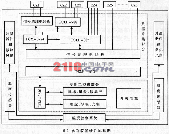 本装置采用基于PC104总线的箱体式翻盖机械机构。按照实现功能的不同,该装置的硬件可分为两大部分:诊断调校部分及装置本身的温控部分。系统的硬件原理图如图1所示。其中,CZ1~CZ8为与设备相连的插座:CZ1用来检测电缆短路和断咱故障;CZ2、CZ3主要用来检测该装置的工作信号是否正常,或者检测给该装置施加激励信号后响应信号是否正常;CZ5、CZ6与压力传感器相连,对压力传感器供电,并采集压力信号;CZ7用于调校液体摆;CZ8用来转接手控台的电源,将手控台的27V电压引入系统作为诊断的参考地。
