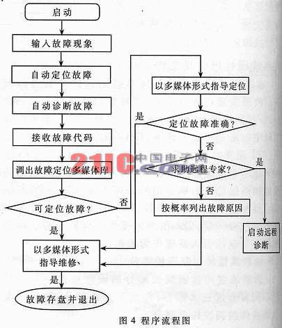 这部分程序的特点主要体现在:以多媒体和图像的形式显示故障、定位故障及指导人员排除故障,取代了传统的以文字为主的专家系统界面,使故障诊断更加直观、形象、准确。程序的流程图如图4所示。