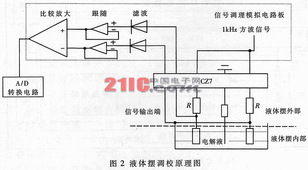 该部分主要由信号调理模拟电路板、A/D数据采集板、插座和液体摆组成,用来调校液体摆。其调校原理如图2所示。信号调理模拟电路板发出1kHz的方波信号,经CZ7施加到的液体摆的输入端,液体摆反馈输出的信号经信号调理模拟电路板滤波、跟随、比较放大后送到A/D板的输入端,根据A/D采集到的结果对液体摆实现精确校准。