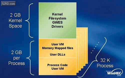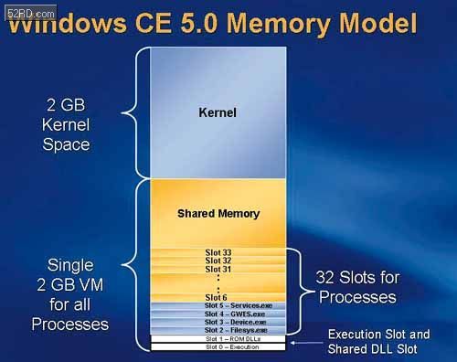 图说:Windows CE 6.0的存储器管理模型。 虽然Windows CE 5.0引进了许多更为杰出的新设计,但是明显需要依靠更高性能的硬件来改善其执行效能,也成了制造商诟病的对象,因此在市面上的手持式产品中,除了高阶机种以外,甚少见到具备低阶硬件产品中采用Windows CE 5.0,大多是采用其它如Symbian等效率表现较佳的作业程序取而代之。不过这样的情况在Windows CE 6.0发表之后,可望会有相当大幅度的逆转,对于硬件端设计来说,Windows CE 6.0的架构可以更为有效的利用总体运算以及其它硬件资源, 首先从核心架构来谈,Windows CE 3.0到5.0使用的虽然是重新架构过的核心,以支持更为关键的即时应用,但是其核心构成基础仍有很大一部分是从更旧版产品中延伸应用而来,因此许多在存储器管理以及执行绪处理方面仍有许多积弊未除。而由于Windows CE 是一款32位元的操作系统,因此系统平时是执行于4GB的虚拟定址存储器中,但是从Windows CE 1.0版到5.0版,都是采用分层保留的方式来进行这4GB虚拟空间的管理,其中2GB会被系统核心所保留,而较低层的2GB空间则是被分配作为存储器分页使用,每个执行中的程序则是可以各自分配到32MB的虚拟记忆”槽”,这些程序有很大部分是属于核心或系统的服务方面,包含了硬件装置的管理、视窗绘图以及事件子系统、档案系统等等。