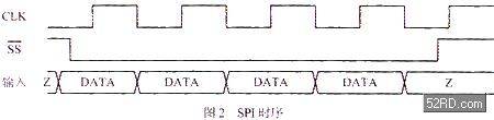 2.2 SPI时序 在SCLK的下降沿上数据改变,同时一位数据被存入移位寄存器,SPI时序如图2所示。