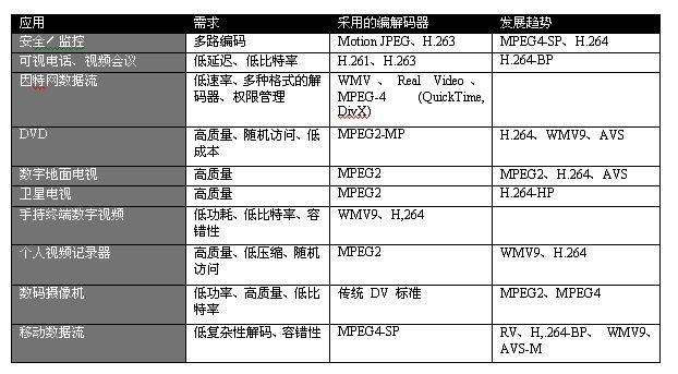 11. 市场趋势与应用 视频压缩正在市场中催生数量日益增长的数字视频产品。采用数字视频压缩技术的终端设备范围广泛,从电池驱动的便携设备到高性能基础设备。表 2 概述部分应用、主要需求、采用的典型视频编解码器及其在这些应用中的发展趋势。