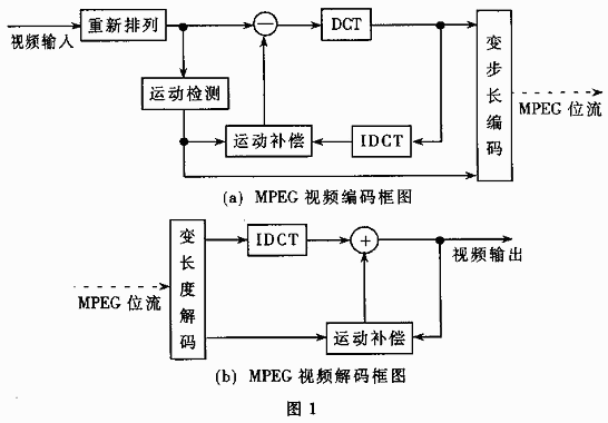 | 要:回顾了mpeg的发展历史,介绍了mpeg-1、mpeg-4和mpeg-7标准的特点,并对mpeg的未来作了展望。 关键词:mpeg 视频 音频 jpeg 1 mpeg的发展及其特点 mpeg-1标准完成的基本任务就是质量适当的图像(包括伴音)数据必须成为计算机数据的一种,和已有的数据(如文字、绘图等数据)在计算机内兼容,并且这些数据必须在现有的计算机网络和广播电视等通信网络中兼容传输。mpeg-1标准有3个组成部分:mpeg视频、mpeg音频、mpeg系统。所以mpeg涉及的问题是视频压缩、音频压缩及多种压缩数据流的复合和同步问题。mpeg-1标准是适用于传输1.5mbps数据传输率的数字存储媒体动力图像及其伴音的编码标准,可以处理各种类型的活动图像,其基本算法对于压缩水平方向360个象素、竖直方向288个象素的空间分辨力,每秒24至30幅画面的运动图像有很好的效果。与jpeg不同,它没有定义产生合法数据流所需的详细算法,而是在编码器设计中提供了大量的灵活性,另外定义已编码位流和解码器的一系列参数都包含在位流本身当中,这些特点允许算法可以用于不同大小和宽度比的图像,也可以用在工作速率范围很大的信道和设备上。 mpeg-1标准压缩首先对色差信号进行亚采样,减少数据量,采用运动补偿技术,减少帧间冗余度,利用二维dct变换云除空间相关性,对dct分量进行量化,舍去不重要的信息,将量化后dct分量按照频率得新排序,将dct分量进行变字长编码,最后对每个数据块的直流分量(dc)进行预测差分编码。mpeg视频的编码和解码框图如图1所示。