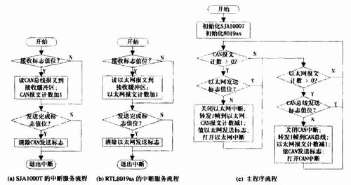 处理器对SJA1000T和RTL8019AS 的操作都使用了中断方式,通信模块的软件程序可以分成SJA1000T 中断服务程序、RTL8019AS中断服务程序和主程序3 个部分,是典型的前、后台处理结构。在中断服务程序中,将收到的CAN 总线报文和以太网报文读入内存中的缓冲区,并累加缓冲区内还未处理的报文计数。在主程序循环中,轮流处理两个缓冲区中的报文,并减小报文计数值。图6 是SJA1000T的中断服务流程、RTL8019AS中断服务流程、主程序的流程。由于SJA1000T内部的接收缓冲区只有64B ,所以在程序中定义了容纳32个Frame结构体数组can- rbuf [ ]并组成环形缓冲区。同时也定义了相同大小的数组eth- rbuf [ ]组成以太网接收的环形缓冲区。