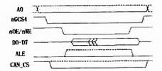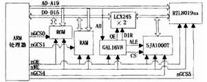 图2 系统的硬件连接示意图 GAL 芯片选用GAL16V8D-15LP ,它的传播延迟时间为15ns ,反馈延迟时间为7ns ,适于较高速度的工作。除了产生总线收发器芯片的控制信号外,同一片GAL 还用来产生SJA1000 需要的控制信号。根据处理器S3C44B0x 的输出信号, 包括为SJA1000分配的地址组选通信号nGCS3和RTL8019分配的地址组选通信号nGCS4、读写信号线nOE和nWE,可以产生总线收发器LCX245所需要的DIR和OE信号,各信号如图3 所示。