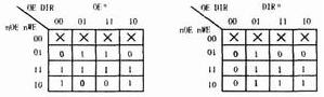 图4 OE 和DIR 次态 卡诺图 根据卡诺图重新写出的次态逻辑产生式,消除单独输入(包括OE 和DIR 的当前状态) 变化可能引起的竞争- 冒险现象后为: