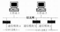 现有的CAN 总线到以太网的通信实现方案中,采用较多的是使用一台连接以太网的计算机,在计算机中安装一块内置式CAN通信板卡;或者通过计算机并行和串行接口外接CAN 的通信模块。这种方法有一定局限性,例如,使用计算机体积大,成本高;计算机故障后的重启速度慢,这可能严重影响系统的工作。采用基于ARM微处理器的单板机系统建立CAN-Ethernet 通信模块,可以很好地解决上述问题,降低系统的成本,提高其性能。CAN-Ethernet通信模块连接以太网和CAN 总线的结构如图1 所示。在以太网和CAN 总线之间,可以挂接一个通信模块连接两种网络,也可以使用多个通信模块形成多个通路。对于第二种情况,以太网上的计算机可以通过指定IP地址和上层协议的端口选择通路。