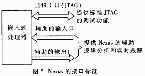 Nexus将调试开发分成四级,从第一级开始,每级的复杂度都在增加,并且上级功能覆盖下一级。第一级使用JTAG的简单静态调试;第二级支持编程跟踪和实时多任务的跟踪,并欢用户用I/O引脚作为多路复用辅助调试口;第三级包括处理器运行时的数据写入跟踪和存储器的读写跟踪;第四级增加了存储替换并触发复杂的硬件断点。从第二级开始,Nexus规定了可变的辅助口。辅助口使用3~16个数据引脚,用来帮助其他仿真器和分析仪之类的辅助调试工具。其示意如图5。 通过Nexus标准可以解以下问题: %26;#183;调试内部总线没有引出的处理器,如含有片内内存器的芯片; %26;#183;传统在线仿真器无法实现的高速调试; %26;#183;深度流水线和有片上Cache的芯片,能够探测具体哪条指令被取和最终执行; %26;#183;可以稳定地进行多内核处理器的调试。 4 调试技术的展望 通过上面的分析可以看出,目前的调试技术可以在频率100MHz、内部总线外部不可见、需要进行实时跟踪的情况下分发挥优势,弥补传统的远程调试器和在线仿真器的不足,并且成本非常低廉。 同时,调试技术还在不停地发展,目前IEEE1149.4标准也已经产生。它主要是将边界扫描结构用于处理模数混合芯片的调试。Nexus也已经完成了标准的制定并有厂商开始在芯片上提供Nexus的调试硬件模块。但是这些标准到底会不会被各个芯片厂商所采用,还有等时机的成熟。特别是两大主流内核公司ARM和MIPS分别采用自已独特内核调试技术。ARM采用基于JTAG版本的E-Trace,而MIPS则是用EJTAG——加强的JTAG技术。它们对Nexus的态度也是旁观等待。